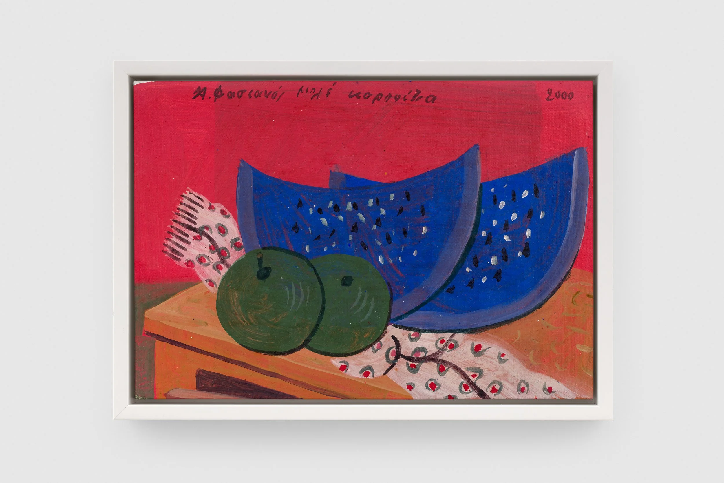 The young artist soon attracted the attention of gallerists du jour including Paul Facchetti and Alexandre Iolas, exhibiting alongside Giorgio de Chirico, René Magritte, Georges Mathieu, Martial Raysse, Jean Paul Riopelle and Niki de Saint Phalle. His works travelled to Tokyo, Sāo Paulo, Beirut, Istanbul, and across Europe. In 1972 he represented Greece in the Venice Biennale, and went on to be awarded Officier de la Légion d’Honneur and Commandeur de l’Ordre des Arts et des Lettres in France. In addition to his paintings, Fassianos’s irrepressible and polymathic output included architecture, costume and stage sets for the National Theatre of Athens, furniture design, book illustrations and editions, playgrounds and toys, and his own lyrical and evocative poetry. Moving between Paris, Athens, and the island of Kea, he built and inhabited his own world, one that became immediately recognisable and nationally – and internationally – beloved.