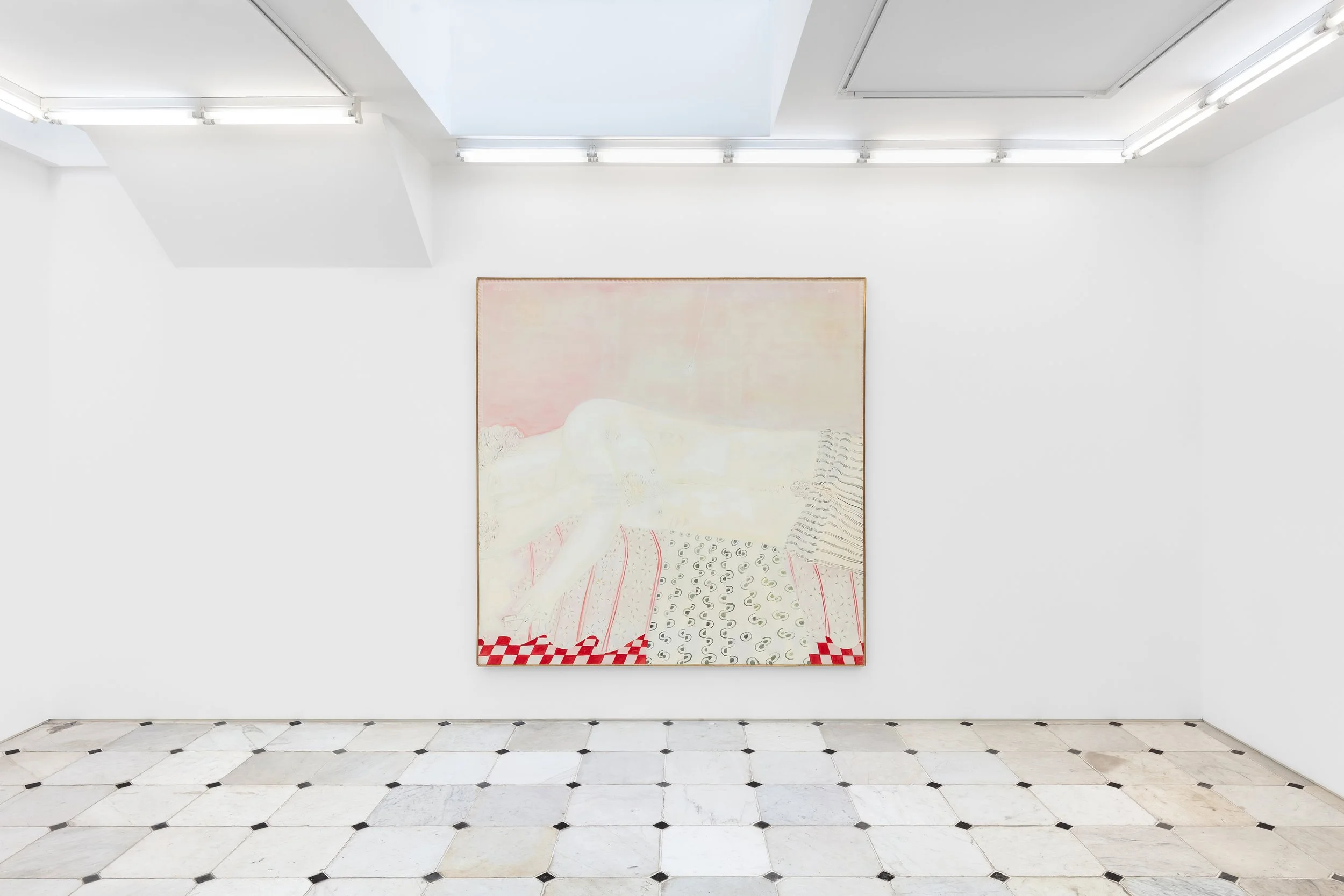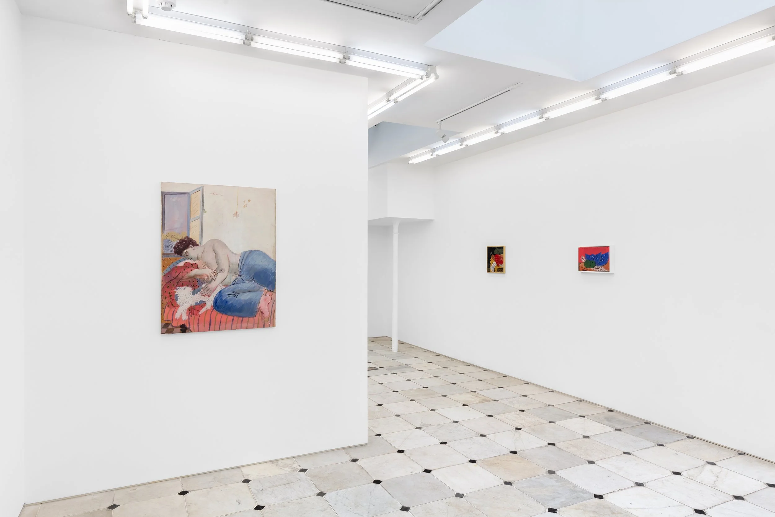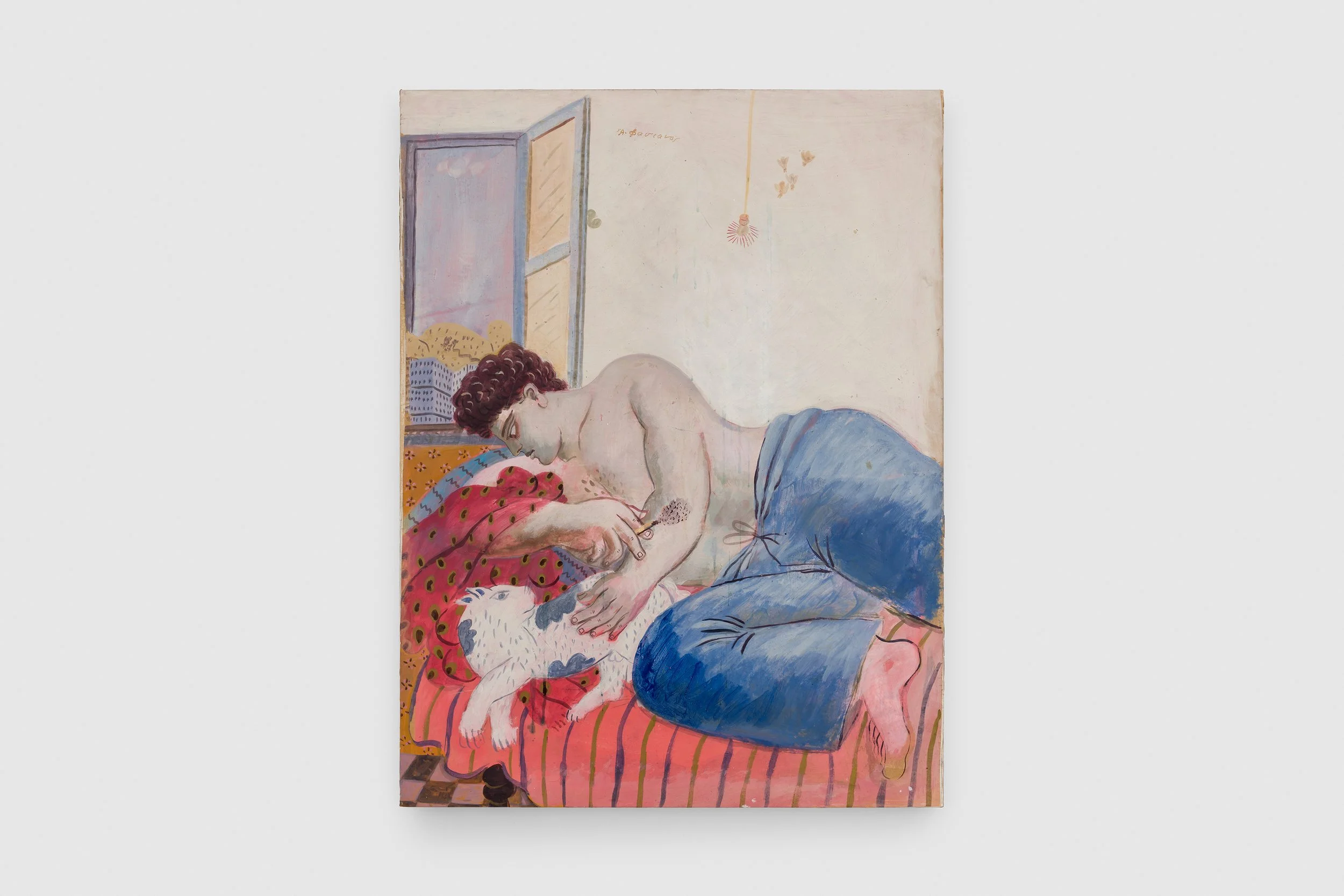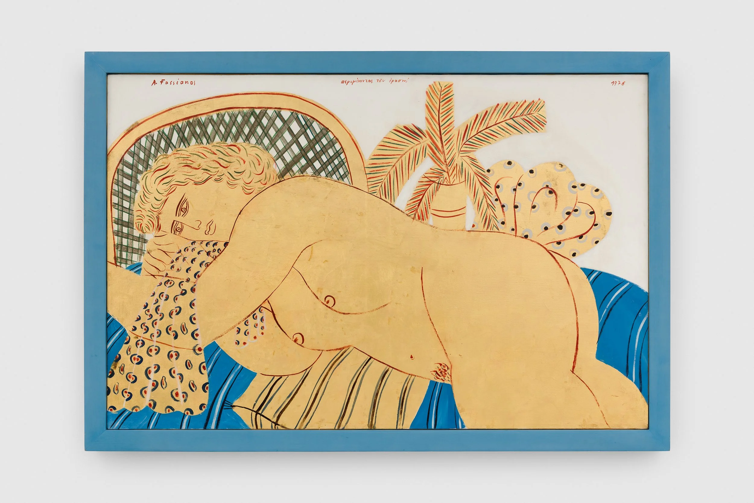 For the many decades Fassianos embraced life in France, he always kept Greece close to his heart – as he would say, like a bee he held his honey, his home, wherever he went. His paintings carry the warmth of the Mediterranean and exude sensual and sensorial pleasures: the sweetness of summer fruits, the downy fur of a cat, the fragrance of a rose, the coo of a dove, the depth of a night sky. The artist developed his own vernacular, filling his paintings with repeating symbols such as blades of wheat to represent life, rebirth, and nature; scarves and bicycles for the debonaire liberté of Paris; birds as a sort of signature, as his name translates to ‘pheasant’ in Greek; and mirrors as reflections of the self, which never quite match the gazer. Many of the paintings on view evoke the containment of a room, small spaces of intimacy, rumination, and voyeurism within the cacophony of a city, with layers of other lives wafting through the windows. These vignettes are vivid and languorous, their Adonisian figures recumbent and windswept and in a trance-like state of soft contemplation, perhaps dreaming about a lover or their home. Mythologising the quotidian, Fassianos reveals mysticism in the everyday by imbuing his works with light, humour, and insouciance, as well as longing, melancholy, and deep introspection.