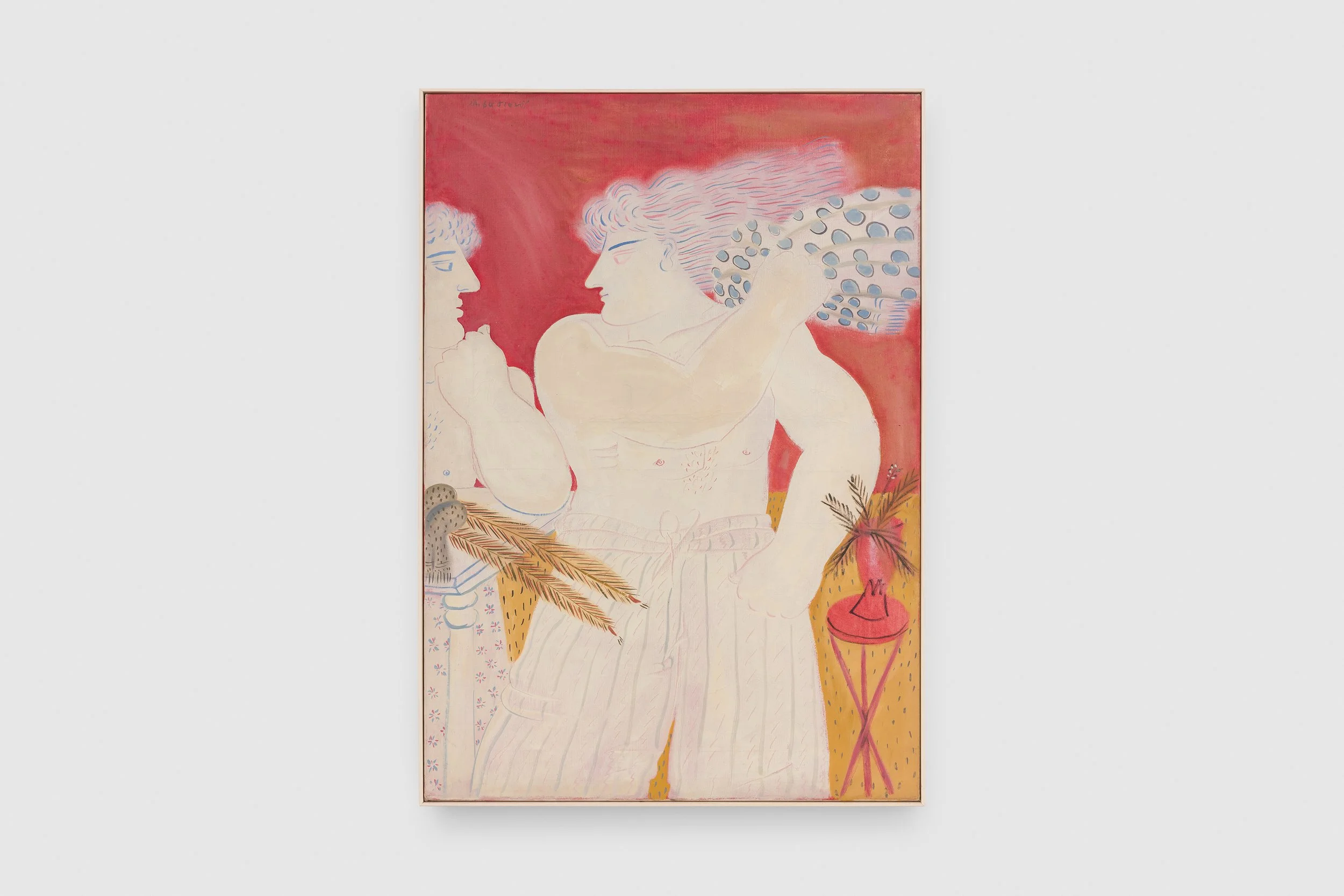 The exhibition’s title nods to Gilbert Adair’s cult novel, adapted for film by Bernardo Bertolucci, which follows a pack of teenagers navigating the sensual and revolutionary spring of 1968 in Paris with louche precocity and wild abandon. It was during this heady decade that Fassianos first studied in and eventually moved to the French capital, escaping the rise of dictatorship in his native Greece and immersing himself in the literati café culture and pervasive air of freedom. Befriending architects, authors, philosophers, and poets, the artist developed a distinctive style which marries the divinities and mythologies of his home country with his new, enthralling metropolitan existence. Androgynous men and women en déshabillé, angels in bedrooms, windows looking out onto skyscrapers, and blowsy cyclists with scarves trailing in the wind were rendered in shapely planes of white, red, ultramarine, dusty pink, ochre, and green. In the late 1970s, Fassianos entered a ‘Byzantine’ era, adding volume to previously flat figures and incorporating gold and silver leaf to create tableaux reminiscent of the icons he knew so well from Orthodox churches.
