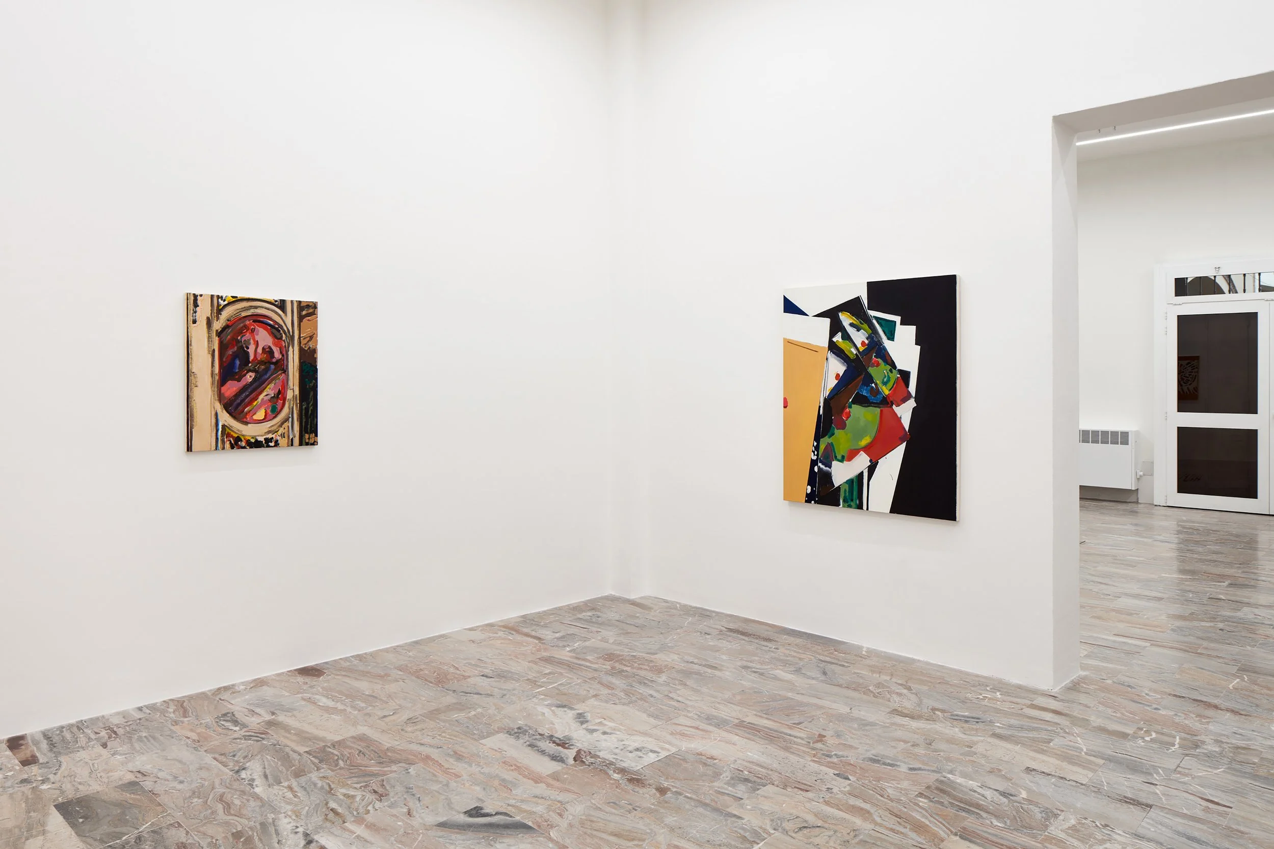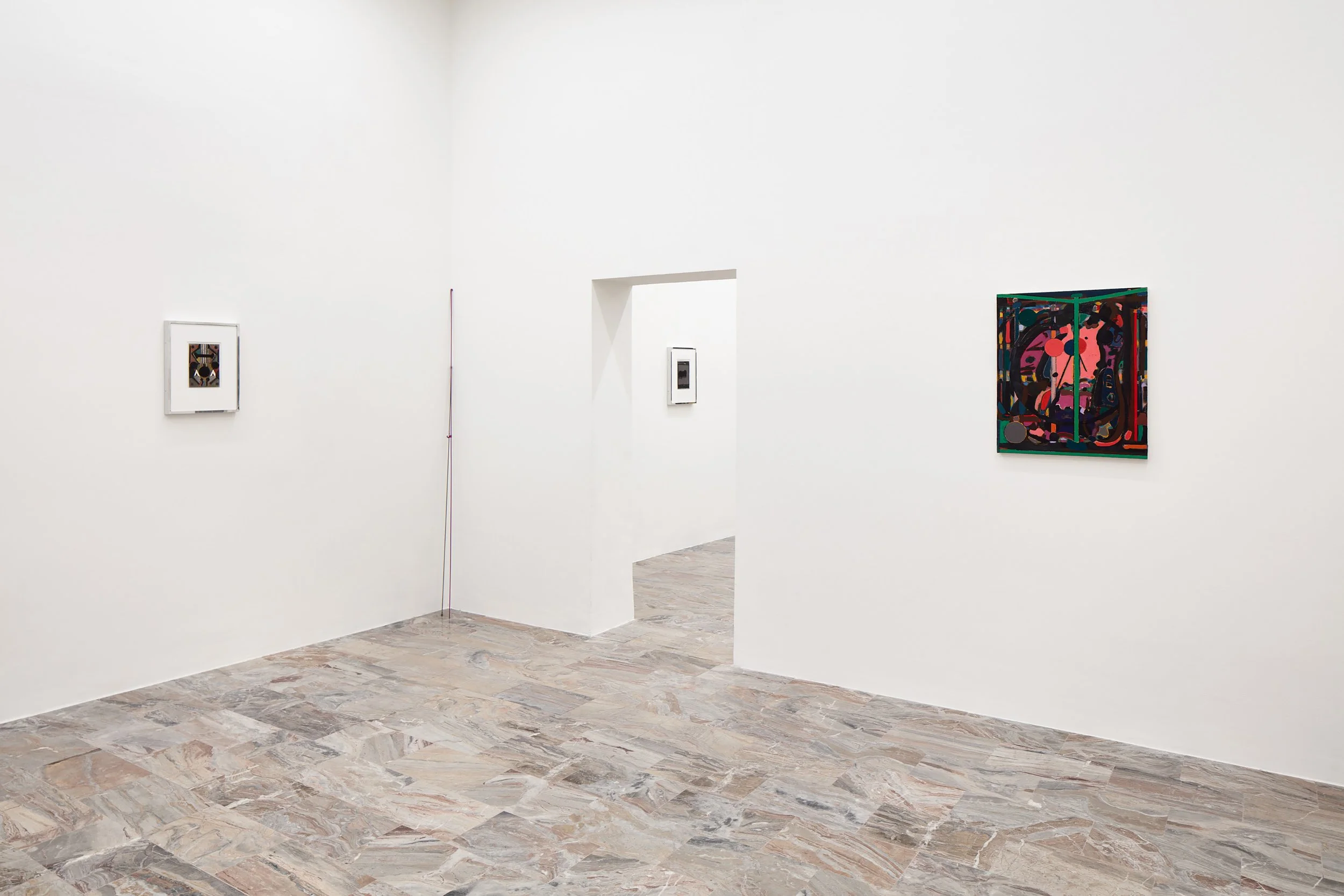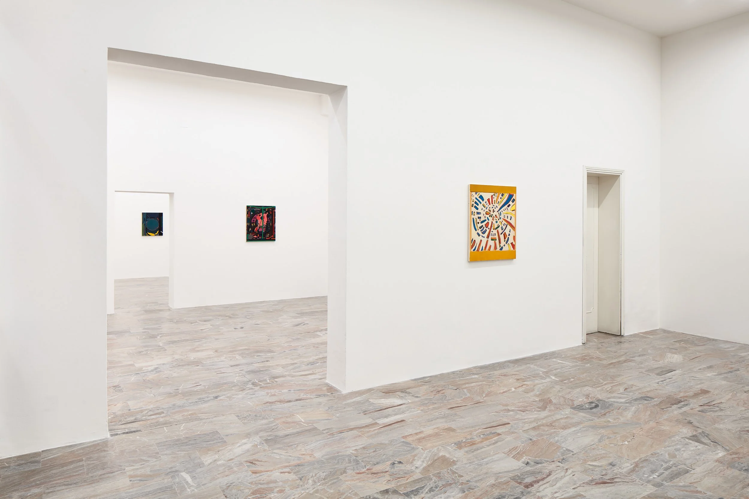 I see this most vividly in Soft Eye (2025), in which energetic, bendy fragments of yellow, orange and blue spiral outwards from a central position, only to hit a frame that contains them: an expression thwarted? I sense Connors needs such a structure in which to play. If one painting leads to another, Connors’s process is self-generating, which raises the question of an exhibition – not as a unified proposition advancing a single point or argument, but as something that offers a glimpse of where the artist is currently at. In writing terms, the show isn’t a full stop so much as a colon, something we’re going through. It enables him a way to reflect on the maelstrom of material that makes up these complex works.