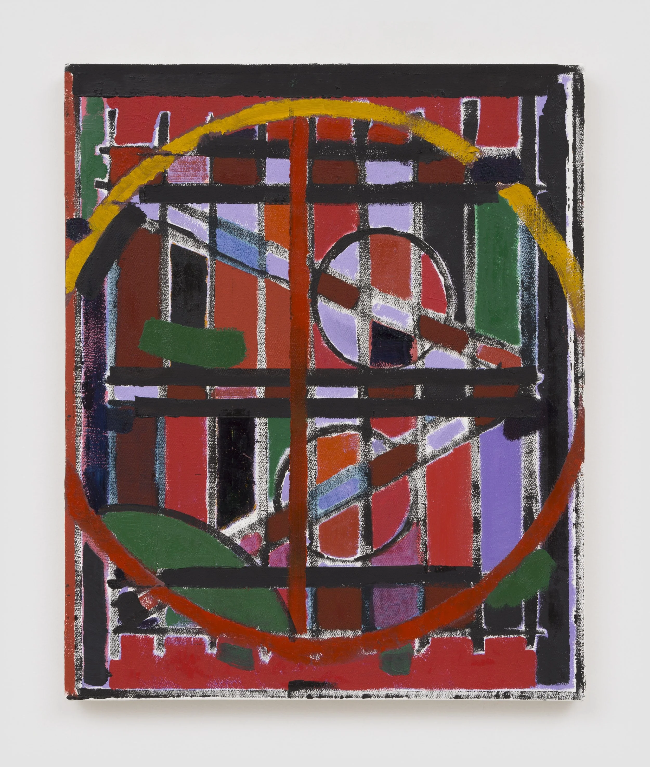There is a studied irreverence in much of Connors’s work, but in this painting the opaque central form anchors the canvas in something less flighty. Similarly, in Font (2026), the vertical sticks of colour – orange and rust – appear to be subsumed by a sequence of overlaid dark blue frames, as though the thrust of the painting were to describe its own objecthood, in the manner of Frank Stella’s The Marriage of Reason and Squalor (1959). Connors’s work, however, is neither as regimented nor as directed as Stella’s; he is willing to fold the structure into the image or to change course midway through.